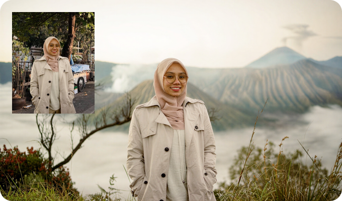 快速将人物和物件融入任何背景中。“调和”功能可在几秒钟内协调光线、阴影、颜色和其他细节,打造无缝衔接的场景。